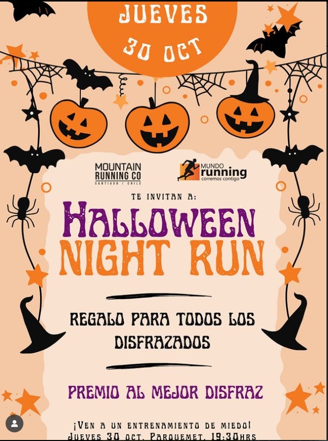 Desde las 19:30 horas, del próximo jueves 30 de octubre se realizará la celebración de Halloween organizado por Mountain Running CO y Mundo Running, evento que se llevará a cabo en el acceso Pedro de Valdivia del Parque Metropolitano de Santiago. La actividad es gratuita y abierta para que todos los motivados en sumarse a Halloween Night Run puedan hacerlo completando el formulario: PINCHA AQUÍ!!