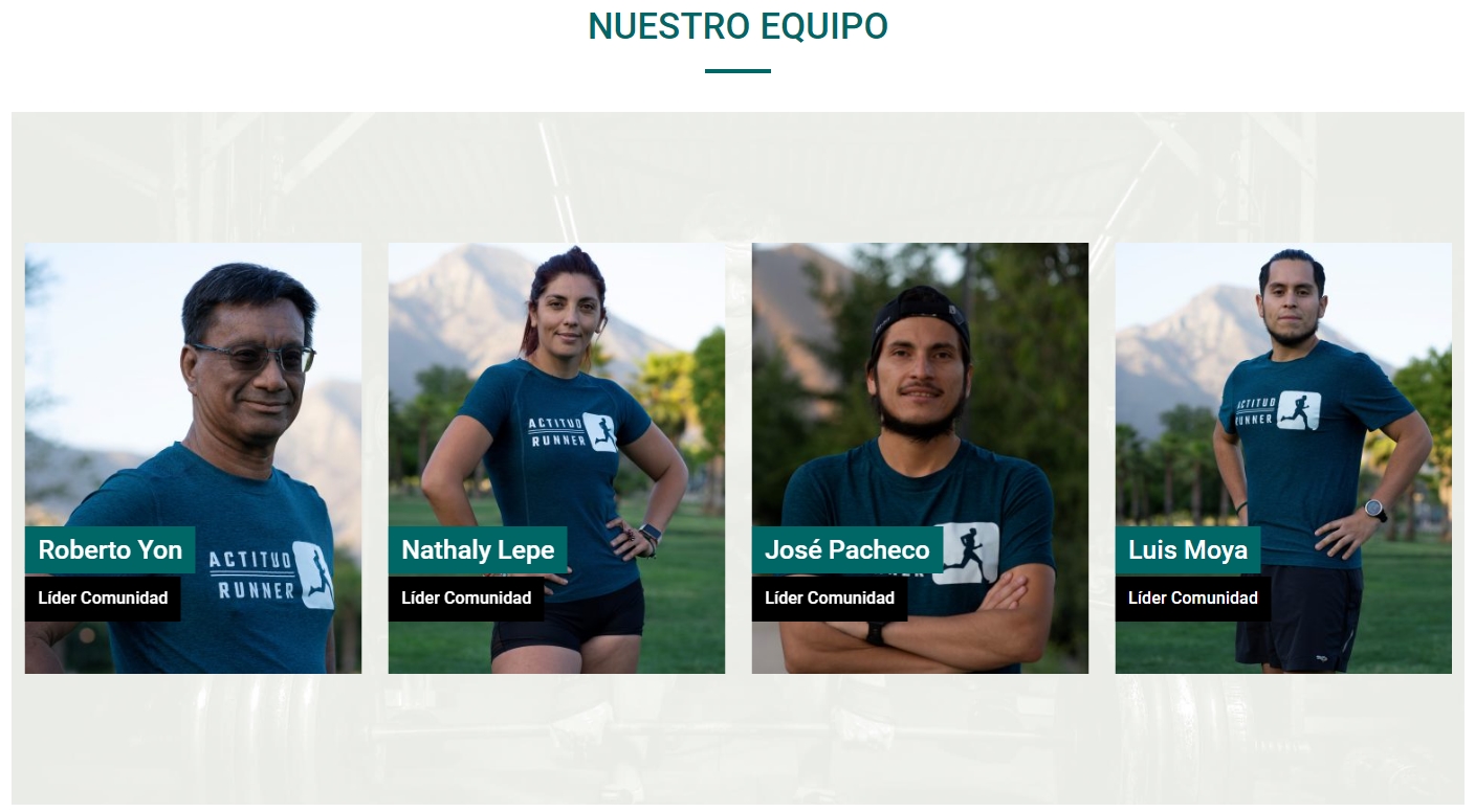 «Actitud Runner» esta liderado por un equipo de profesionales de distintas áreas que están «dispuestos a trabajar de manera colaborativa en la conquista de objetivos personales en esta actividad que nos apasiona», manifiestan en su portal liderado por la Periodista Nathaly Lepe. El equipo de trabajo lo conforman los ingenieros Roberto Yon, José Pacheco y Luis Moya quienes semana a semana motivan a los integrantes de esta gran comunidad a superarse a sí mismos en el running.