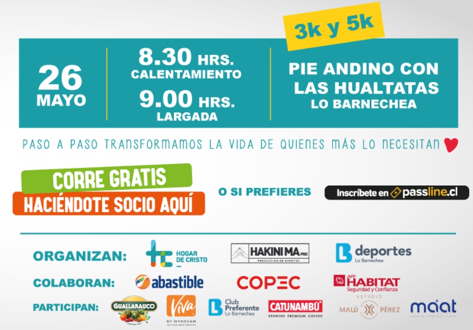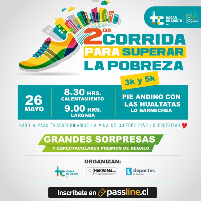 El Hogar de Cristo realizará la segunda edición de su «Corrida para Superar la Pobreza» el próximo domingo 26 de mayo, en la comuna de Lo Barnechea. El evento tendrá circuitos de 3 y 5 kilómetros en una prueba familiar, cuyas inscripciones se encuentran disponibles a través del portal passline.cl