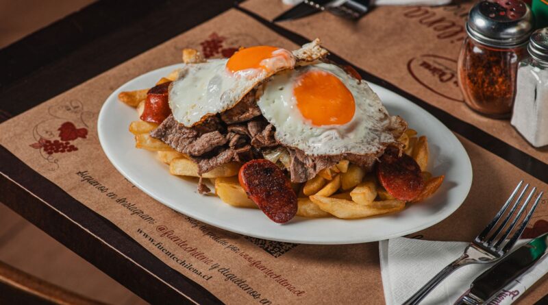 - Papas fritas Fuente Chilena: reinterpretación de la chorrillana con churrasco, longaniza, cebolla caramelizada y huevos fritos al centro.