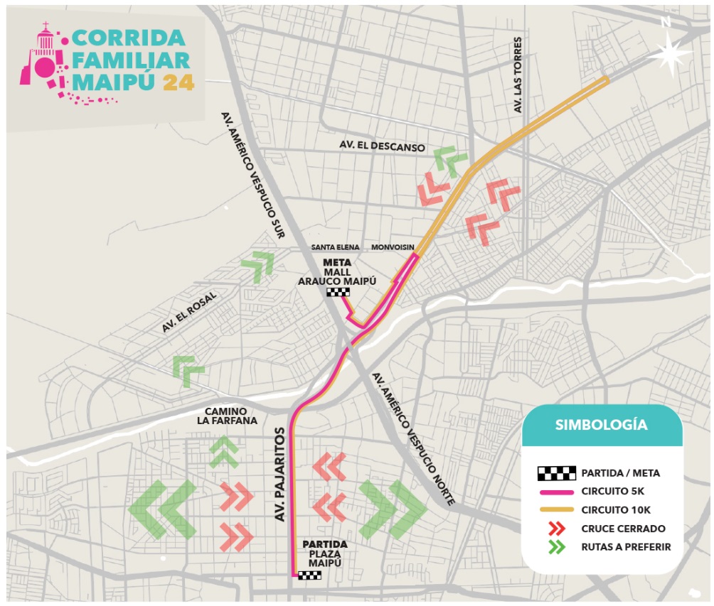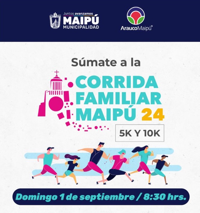 Para esta edición, la corrida contempla recorridos de 5K y 10K, y se habilitarán cupos limitados para 4 mil participantes, quienes podrán inscribirse hasta agotar stock y sin costo desde el lunes 12 de agosto en www.corridafamiliarmaipu.cl.