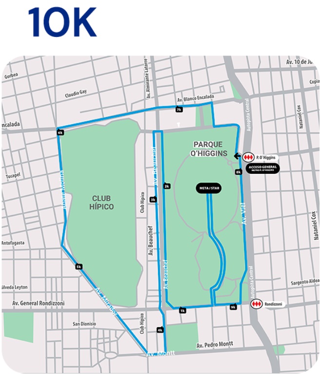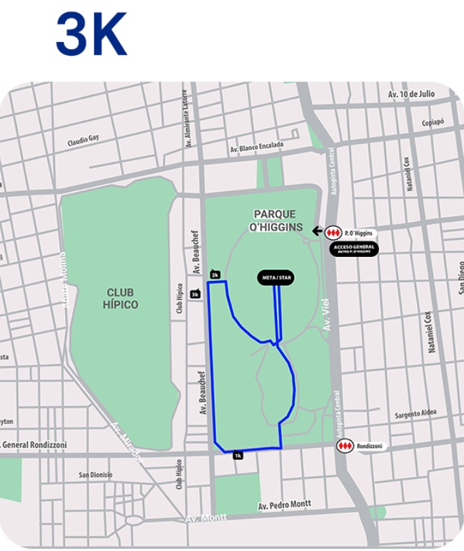 Debido a la magnitud del evento se tienen considerado diversos cortes de tránsito alrededor del parque, los que se extenderán desde las 08:30 a las 13 horas de este sábado. Ambos circuitos de competencia saldrán a las 10 horas del Parque O´Higgins hacia Av. Rondizzoni, y la ruta de 3K debe volver a ingresar por Av. Beauchef; mientras que los participantes de la ruta de 10K deben continuar corriendo hasta el retorno, llegar a Av. Pedro Montt, continuar por Av. Mirador donde estará el punto de abastecimiento en el kilómetro 5, para continuar el circuito por calle Abate Molina, Av. Blanco Encalada, Av. Viel, y luego reingresar al Parque O´Higgins por Av. Rondizzoni. El detalle de cada circuito lo puedes revisar a continuación: