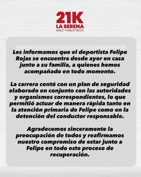 Horas más tarde Felipe Rojas se refirió al atropello: «Mientras participaba de la carrera, fui atropellado violentamente por una persona en estado de ebriedad. El impacto me hizo caer con fuerza al suelo, golpeando mi cabeza, lo que me dejó sangrando inconsciente. Esta persona, lejos de asumir su responsabilidad, se dio a la fuga. Afortunadamente, gracias a la rápida y efectiva acción de Carabineros, fue detenida antes de causar más daño. Ha sido una experiencia muy dura, tanto física como emocionalmente. Agradezco de corazón a todos quienes se preocuparon por mí, enviaron mensajes, y me han acompañado en este proceso. Su apoyo ha sido fundamental. Por ahora, me veré obligado a hacer una pausa en el atletismo. Necesito tiempo para recuperarme plenamente, pero mi deseo es volver cuando me sienta listo, con más fuerza que nunca. Condeno profundamente este acto irresponsable y peligroso, y confío en que la justicia hará su trabajo para que este tipo de situaciones no vuelvan a repetirse», publicó en su cuenta Instagram.