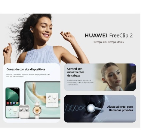 Los nuevos HUAWEI FreeClip 2 ya se pueden adquirir en la HUAWEI Online Store. Están disponibles en los colores azul, blanco, negro y oro rosa, por $169.990.